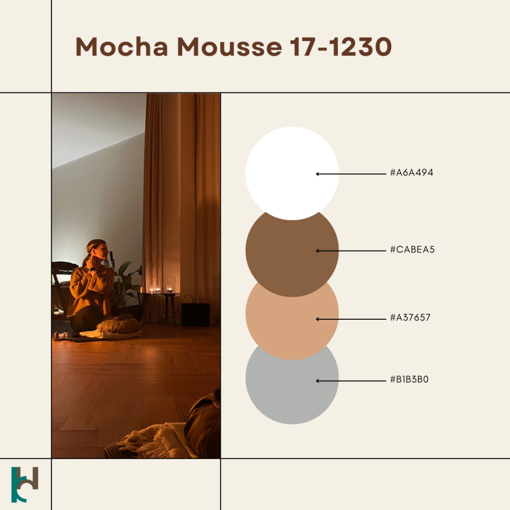 Kolor Mocha Mousse 17- 1230 to barwa, ciepła wpadająca w delikatne brązowe tony. Balansuje pomiędzy kawą z mlekiem, a subtelnym odcieniem czekoladowego musu. Instytut opisuje ten kolor jako ciepły, mocno oddziaływujący na zmysły i sensorykę. Jego łagodna natura sprawia, że chce się nim otaczać zarówno w postaci rzeczy, naturalnych makijaży, jak i odzieży. Brąz kojarzony z ciepłem, ale i bogactwem naturalnej palety kolorów ziemi. Ale to nie wszystko….